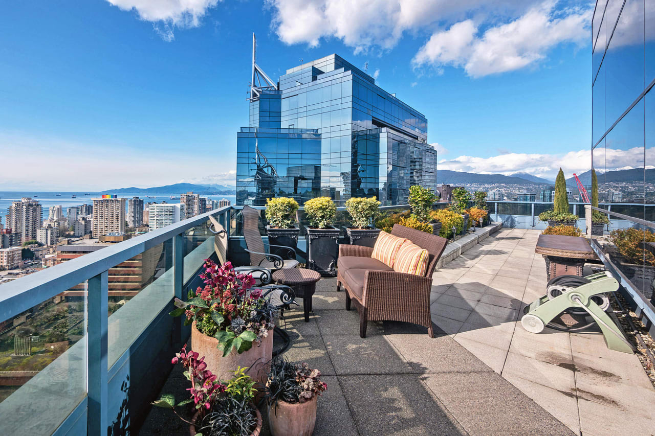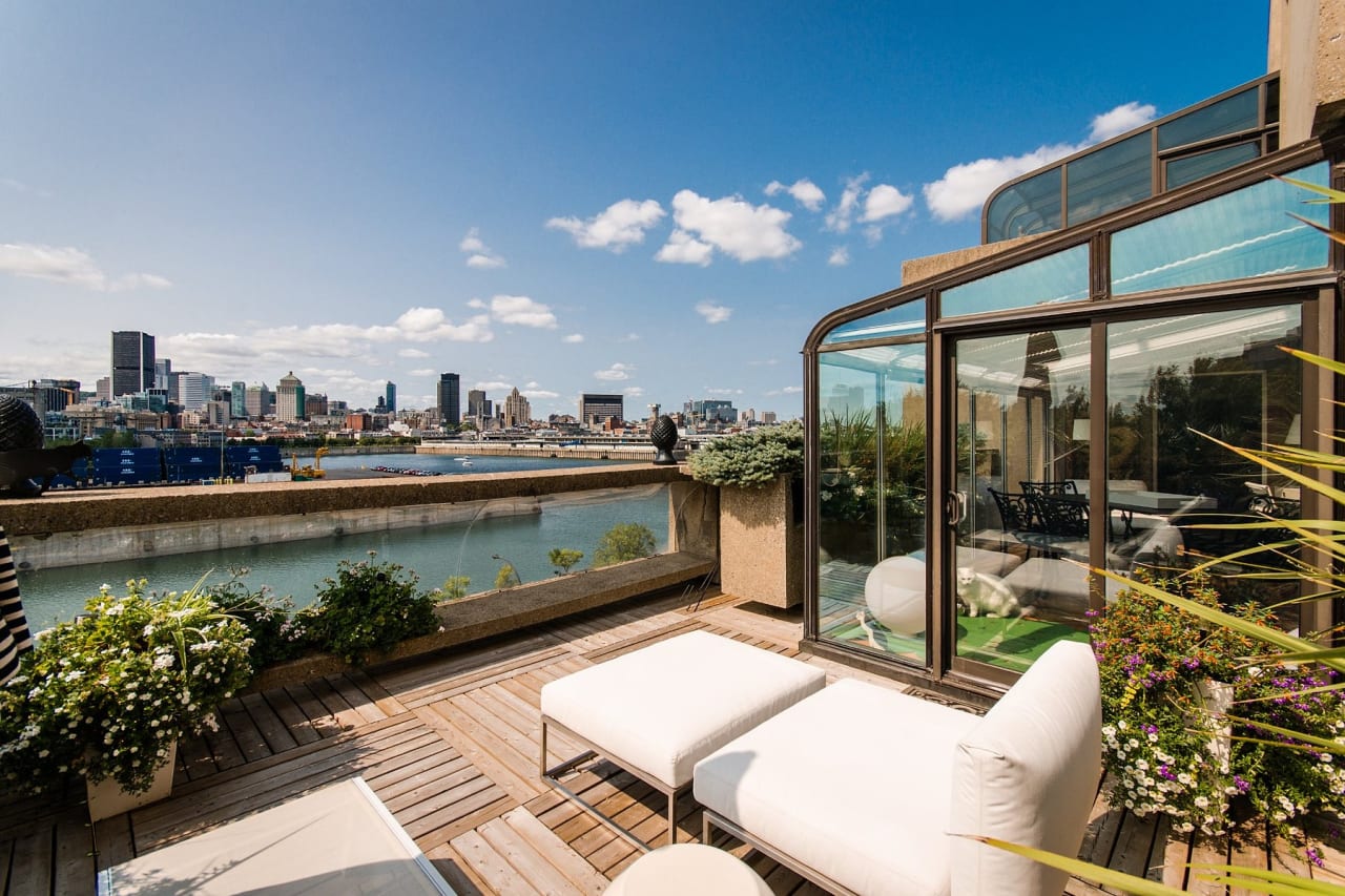 Curation is key when it comes to condos. While it can be tempting to try to pack furnishings for all seasons into your outside living space, focusing on your preferred balcony activities can ensure your patio remains airy and functional. Take this penthouse suite with its expansive terrace: the focus has been placed on enjoying the property’s outdoor hot tub, with barbecuing and lounging as complementary pastimes.